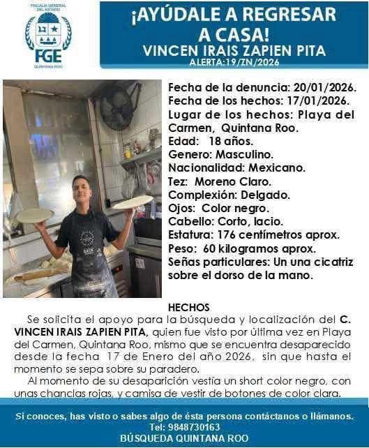 Playa del Carmen localizar a VINCEN IRAID ZAPIEN PITA. godfather122febrero 19, 2026febrero 19, 20260 #playadelcarmen La Comisión de Búsqueda Quintana Roo de Personas del Estado solicita su apoyo para localizar a VINCEN IRAID ZAPIEN…